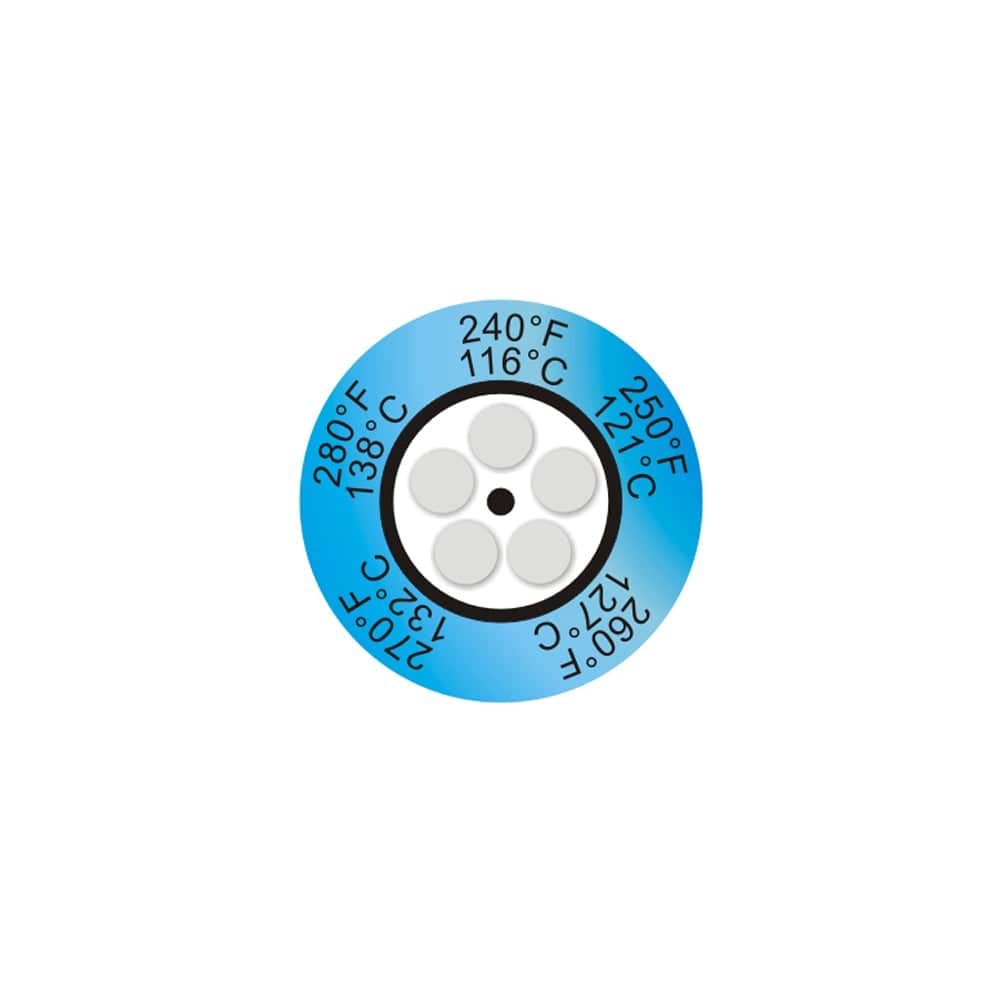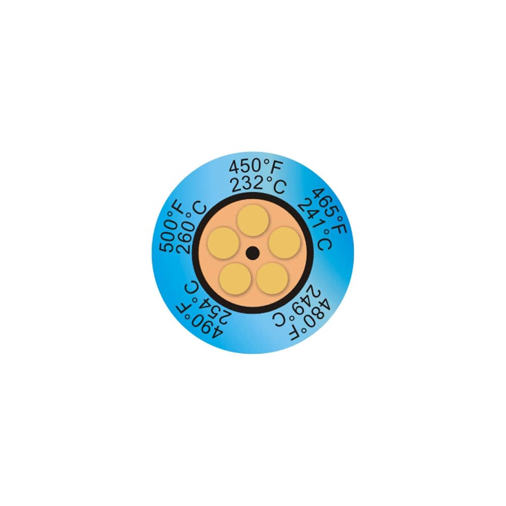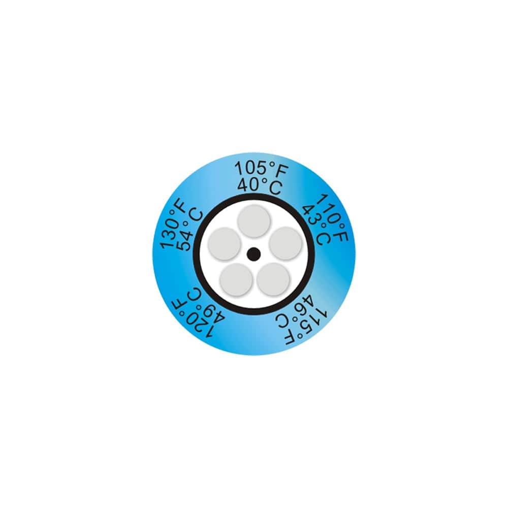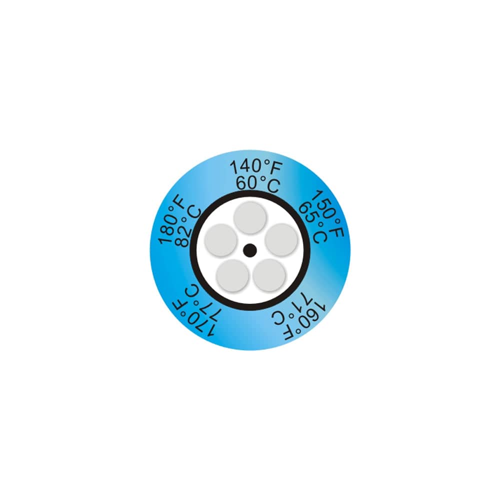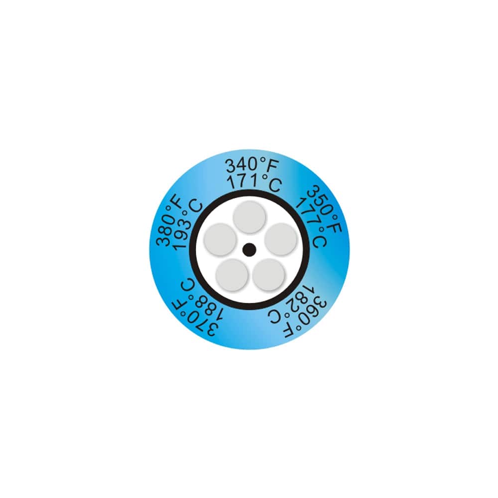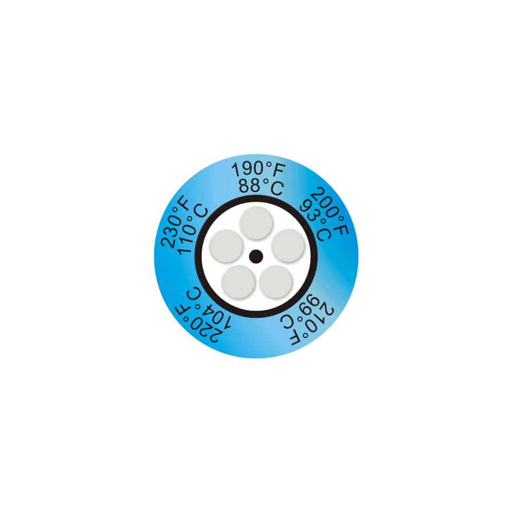 Thermax® 5-Level Clock Temperature Labels provide fast, accurate and permanent indication that a surface has exceeded specific temperature thresholds. Each of the five circular cells darkens irreversibly once its rated temperature has been reached, giving a reliable visual record ideal for process monitoring, quality checks, and equipment diagnostics.